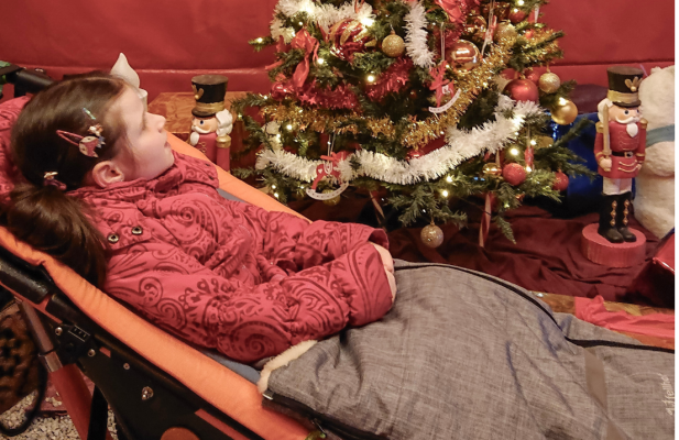 Cassandra ist sieben Jahre alt und nutzt einen Rollstuhl. An kalten Tagen ist sie mit einem Fellhof-Rollstuhlsack gut geschützt. Bei längeren Ausflügen oder wenn sie längere Zeit im Spezialwagen sitzt, zeigte sich jedoch ein Problem: Die Füße kühlten stark aus.
